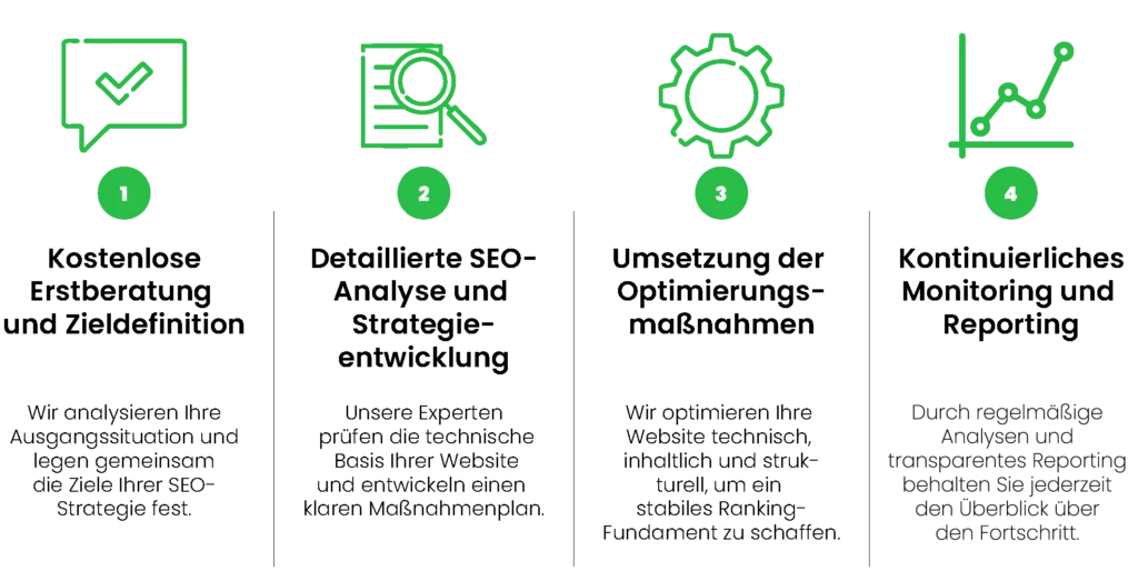 Ein klar strukturierter Prozess ist die Grundlage für erfolgreiche Suchmaschinenoptimierung. Bei Optimerch arbeiten wir nach einem festen Ablauf, der maximale Transparenz und messbare Ergebnisse garantiert. Jeder Schritt baut auf dem vorherigen auf und sorgt dafür, dass Ihre Website langfristig sichtbar bleibt und nachhaltig wächst.