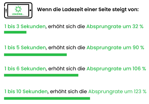 Schnelle Ladezeiten und eine mobilfreundliche Darstellung sind unverzichtbar, da die meisten Suchanfragen heute mobil erfolgen. Bereits wenige Sekunden können über Erfolg oder Misserfolg entscheiden. Eine Studie von Google zeigt: Steigt die Ladezeit von 1 auf 3 Sekunden, erhöht sich die Wahrscheinlichkeit eines Absprungs bereits um 32 %. Bei 5 Sekunden Ladezeit liegt die Wahrscheinlichkeit eines Absprungs schon bei 90 %.