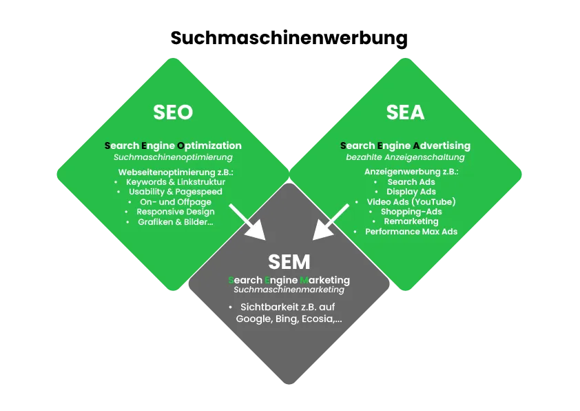 SEA (Search Engine Advertising): Schaltung bezahlter Anzeigen in den Suchergebnissen.