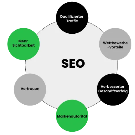 Doch es geht nicht nur um Rankings. Erfolgreiches Website SEO Marketing fördert gleichzeitig den Markenaufbau, Vertrauen und langfristige Wettbewerbsstärke auf. Die wichtigsten Ziele und Mehrwerte lassen sich in sechs zentrale Bereiche gliedern:
