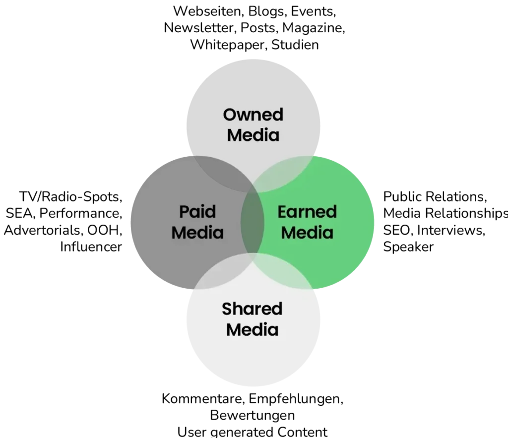 | Owned Media | Eigene Kommunikationskanäle, über die du volle Kontrolle hast | Website, Blog, Newsletter, Podcast | Nachhaltige Markenpräsenz, unabhängige Content-Steuerung, direkte Zielgruppenbindung |